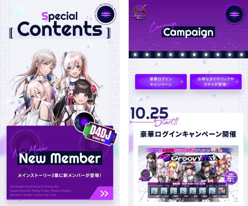スマートフォン向けアプリゲーム D4DJ Groovy Mix の2周年特設サイトを制作いたしました。