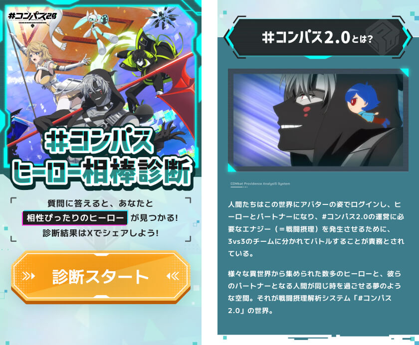 このサイトでは、いくつかの設問に答えることで『#コンパス』のヒーローの中から自分と相性の良いキャラクターが診断される仕組みになっており、ゲームに詳しい人だけでなく、初めて知った人でも気軽に楽しめる構成としています。
