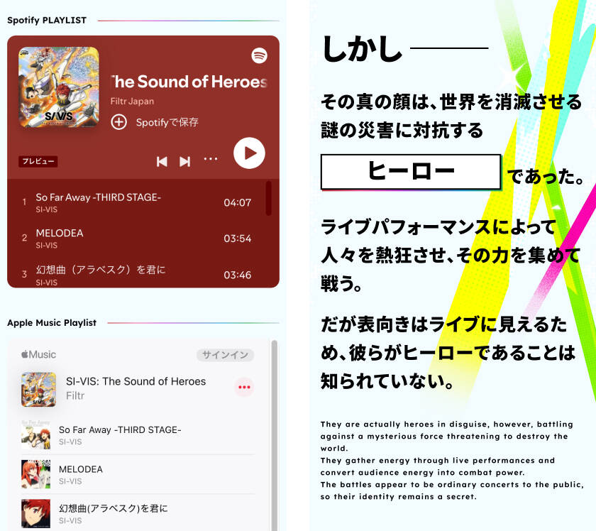 『SI-VIS』は音楽が物語に強く関わる作品であるため、公式サイトでもSpotifyやApple Musicのプレイリスト埋め込みに対応し、視聴前からSI-VISの楽曲に触れられる導線を重視しています。