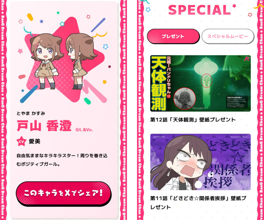 アニメの公式サイトとしてバンドリシリーズらしいトーンを保ちながら、ミニアニメの明るいテンポに合うよう、情報の見せ方をシンプルに整理しています。各話紹介やキャラクター情報、スペシャルページなどをスムーズに閲覧できるよう構成し、ユーザーの欲しい情報が掴みやすい構成にしました。