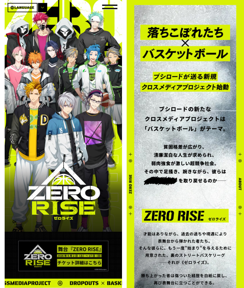 「バスケットボール」をテーマにしたブシロード様の新規クロスメディアプロジェクト、『ZERO RISE(ゼロライズ)』の公式ポータルサイトを制作させていただきました。